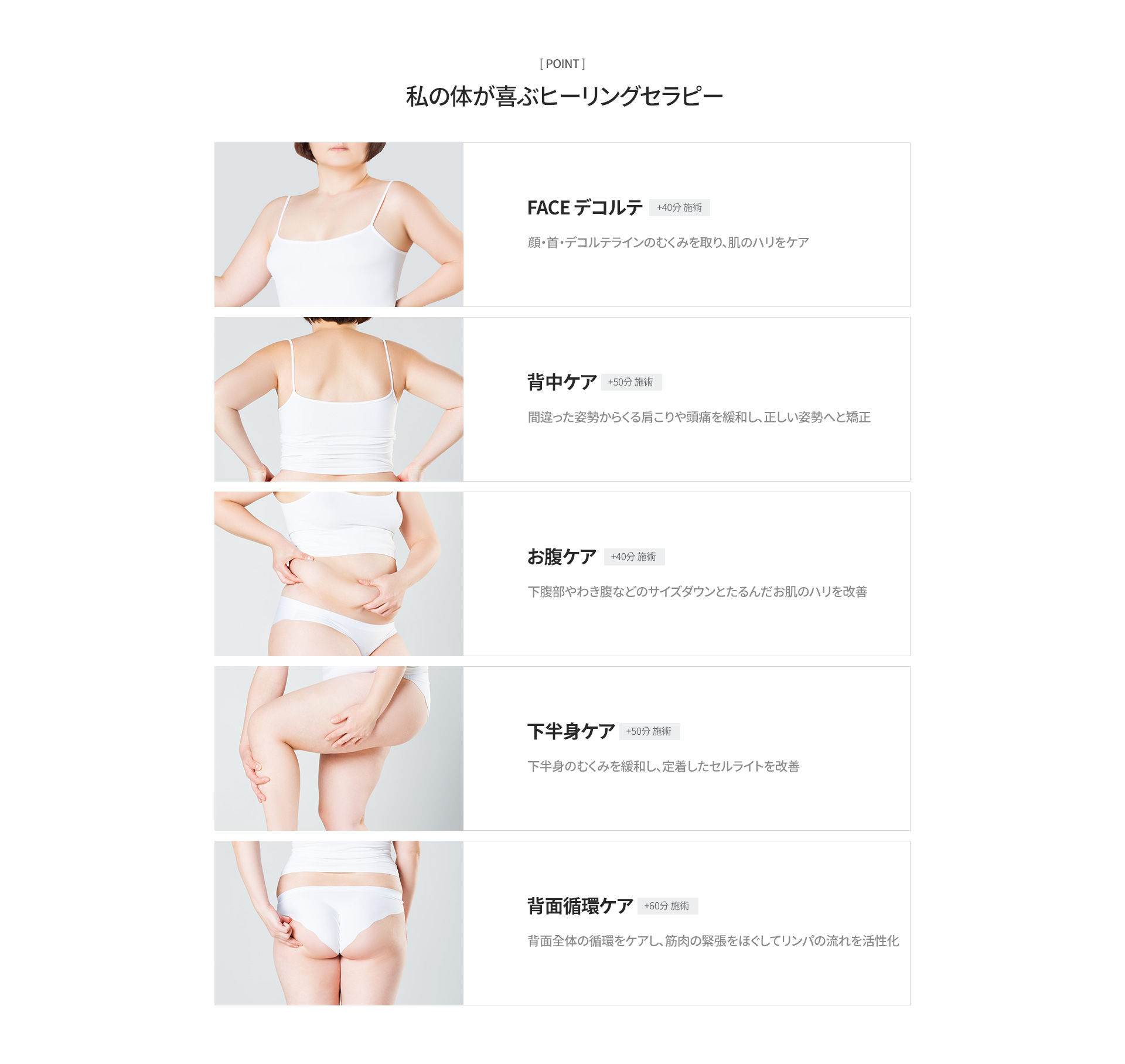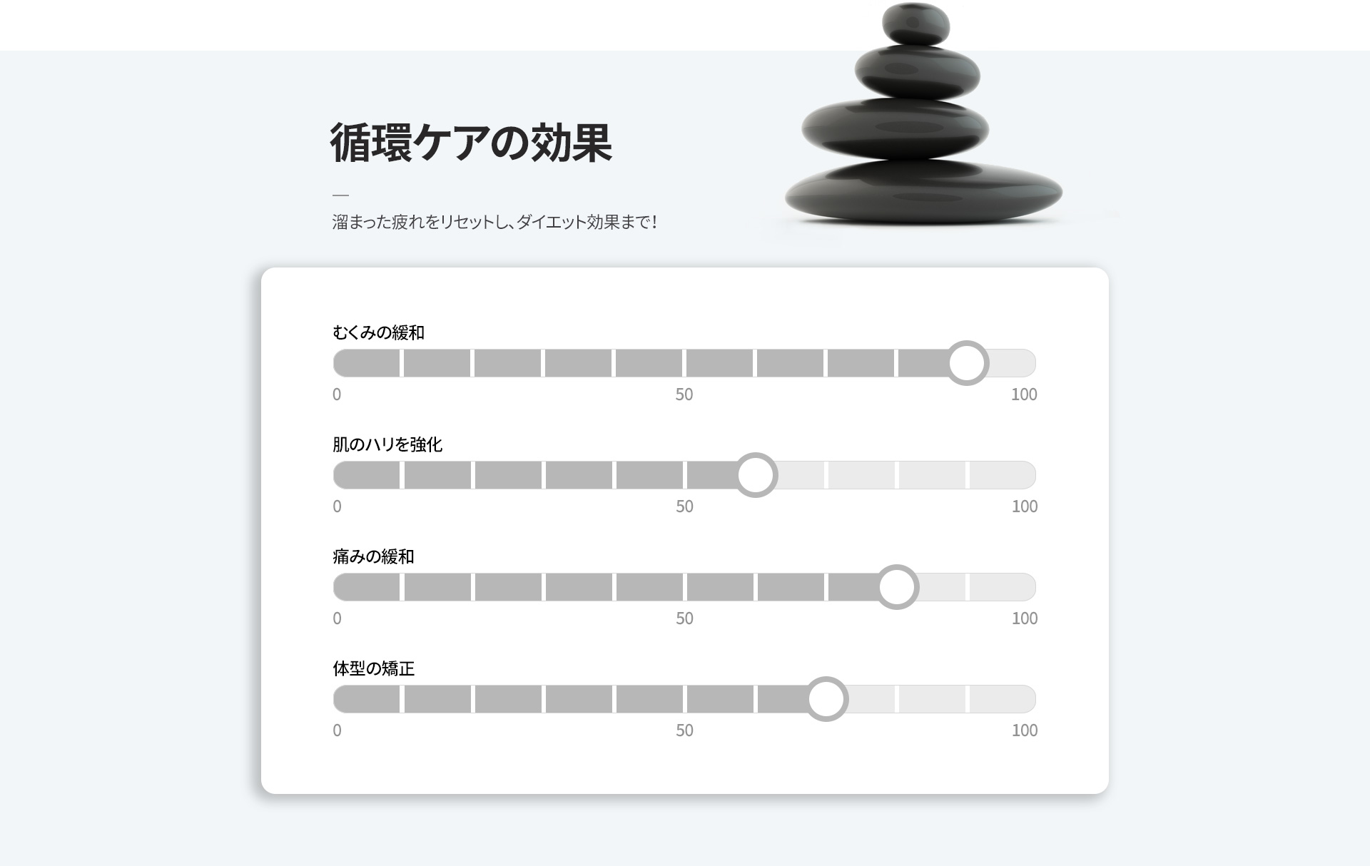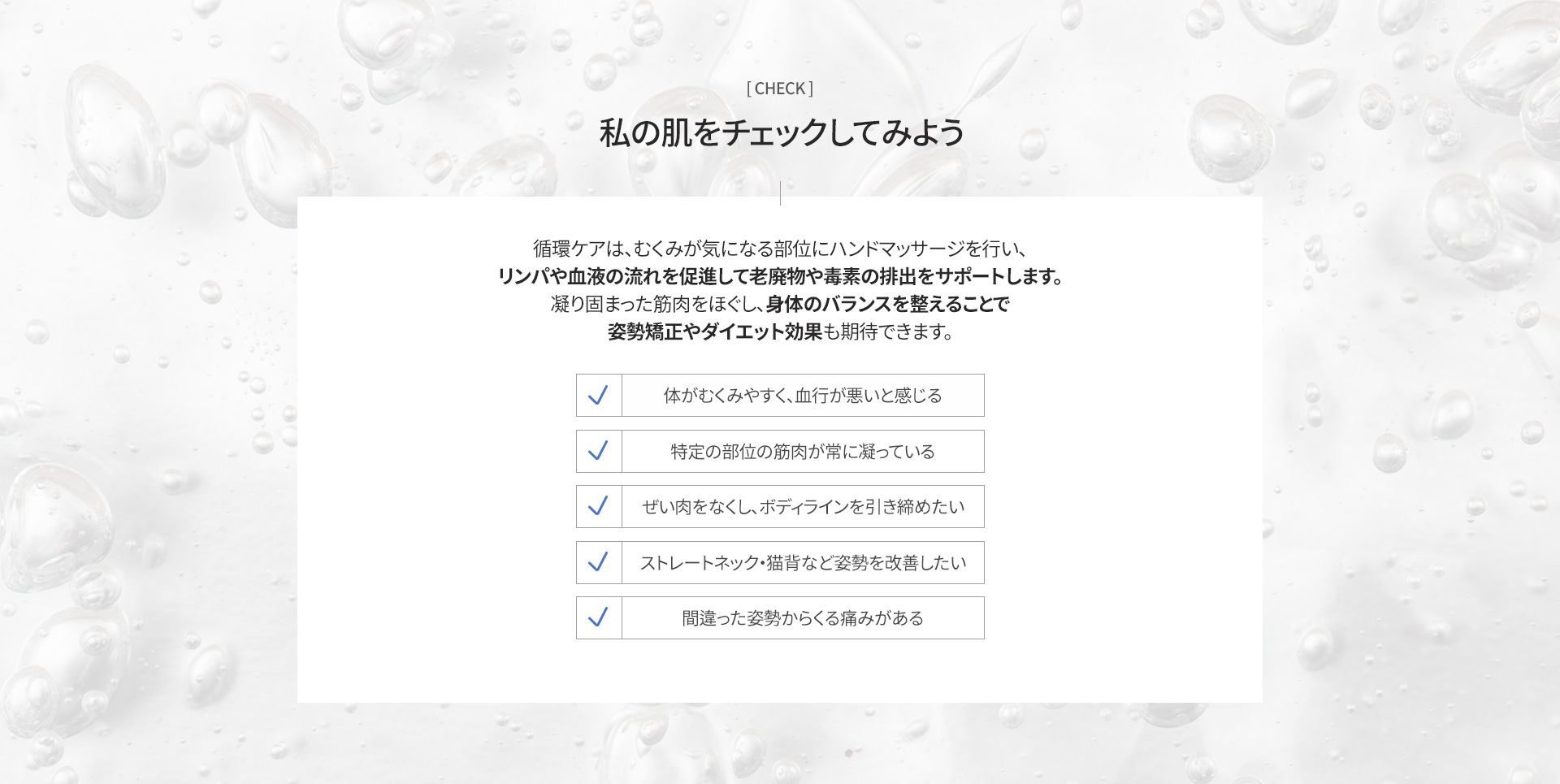 循環ケアは、手技マッサージを通じてリンパや血液の循環を促進し、毒素や老廃物を排出するとともに、体のバランスを整え、体型矯正やダイエット効果があります。
