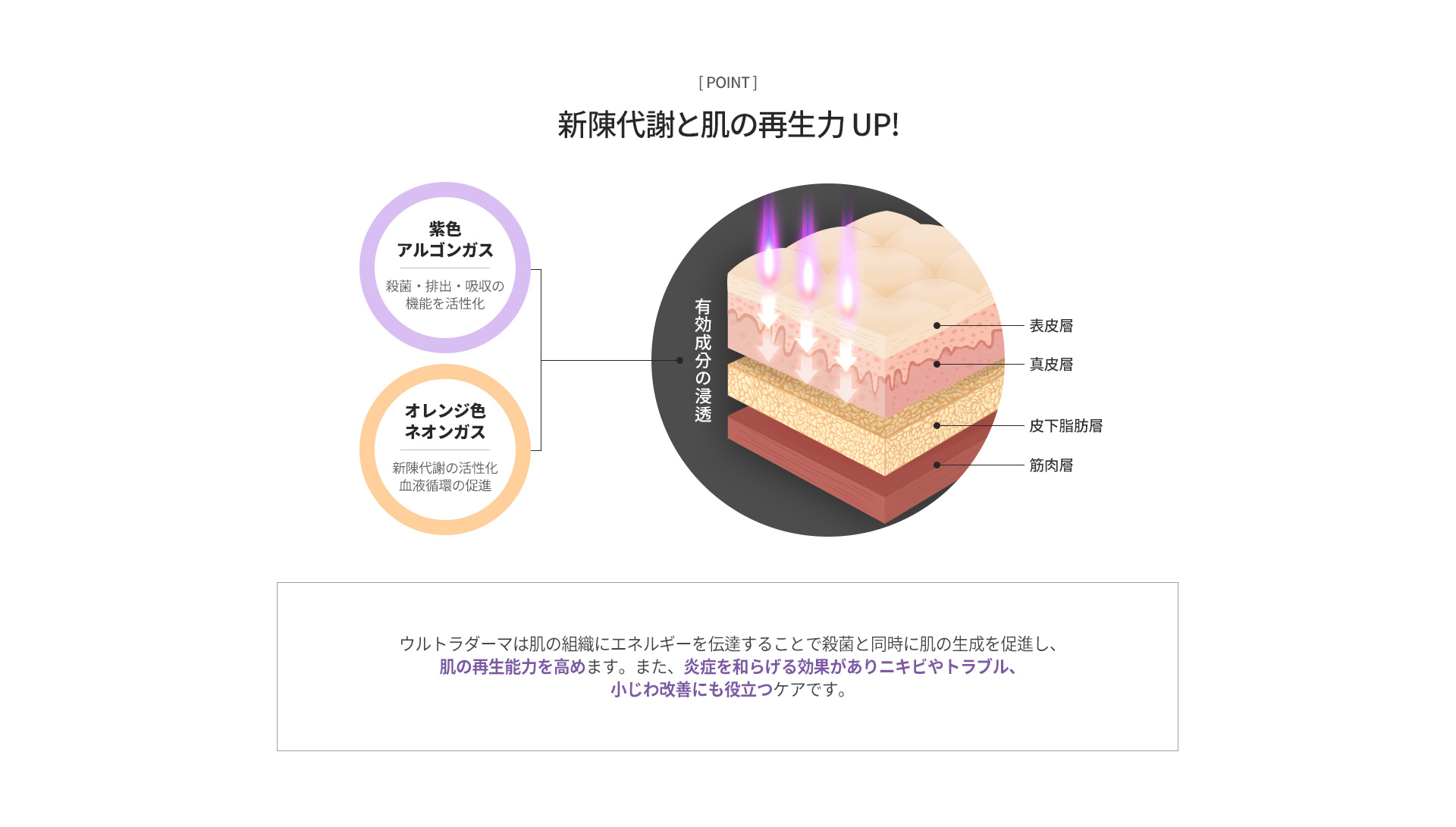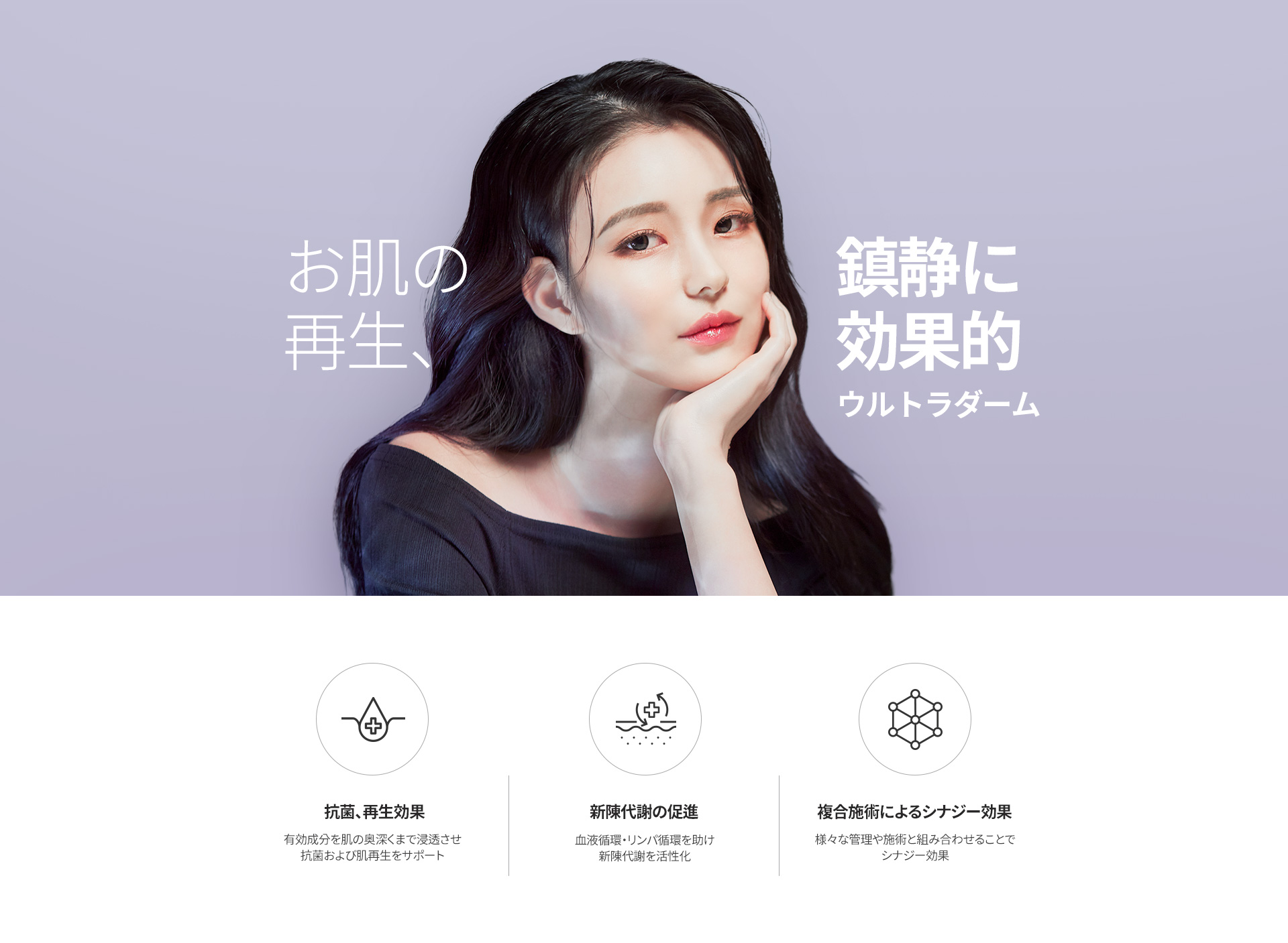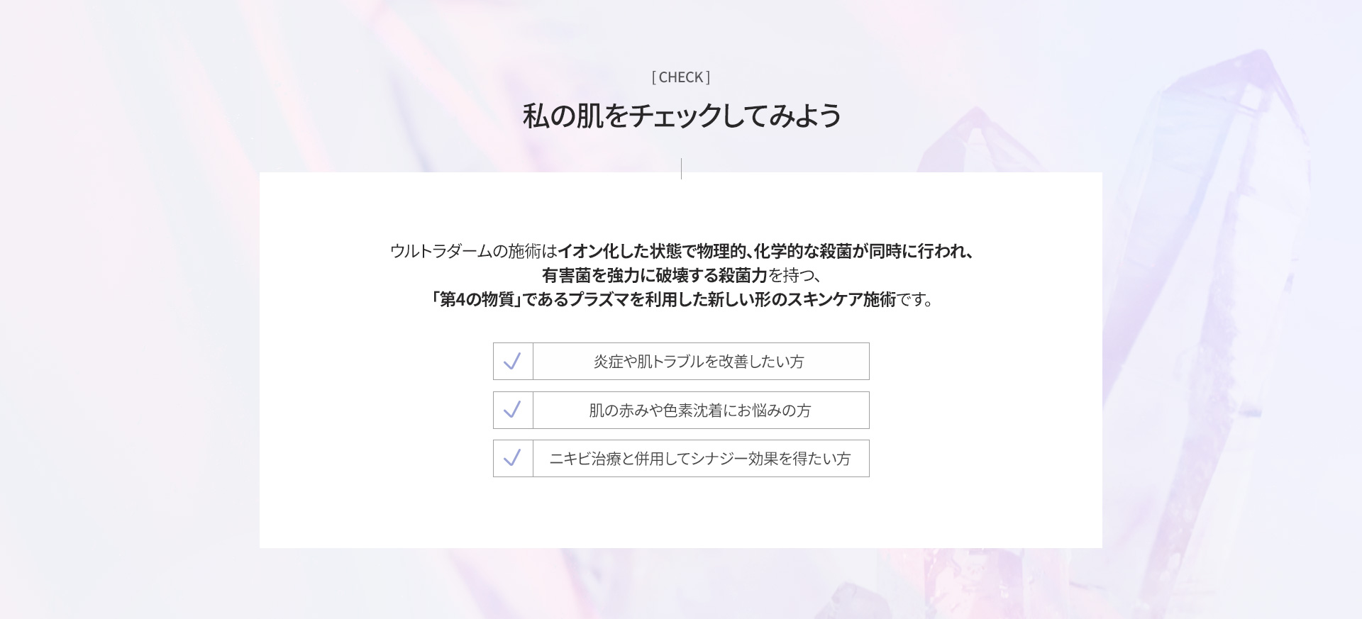 プラズマウルトラダームは、有害菌を強力に破壊する殺菌力を持つプラズマを利用し、炎症や肌トラブルを改善して、肌の再生および抗菌に効果的な施術です。